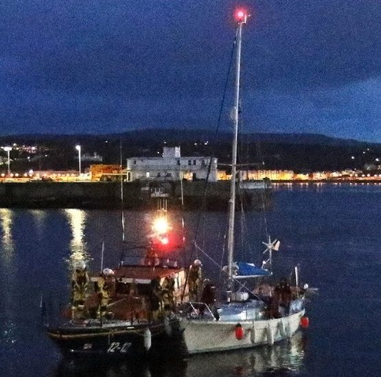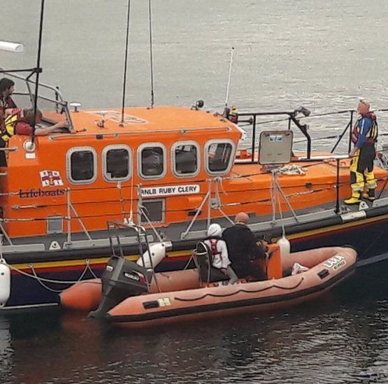 Two people in an inflatable boat are towed to safety after their craft’s engine fails near Peel.