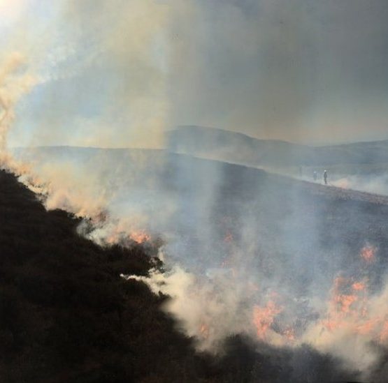 Firefighters work with “hose reels and beaters” to bring a planned gorse fire back under control.